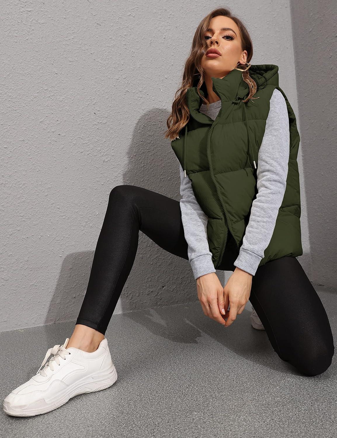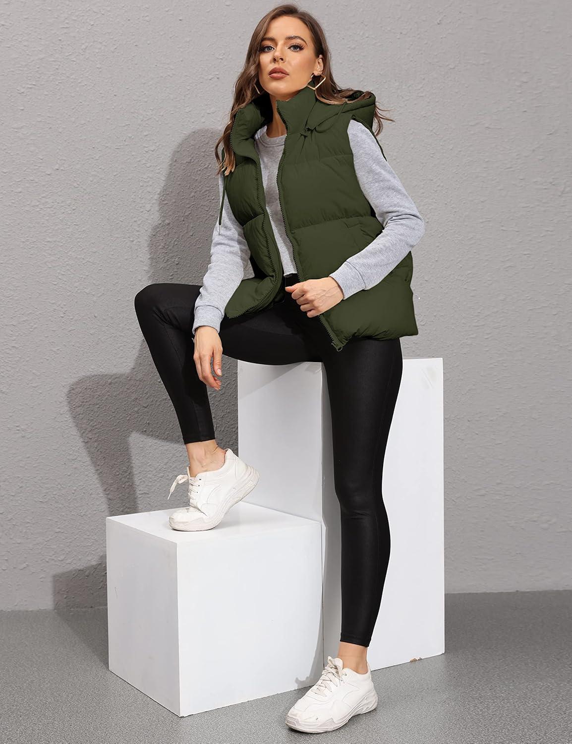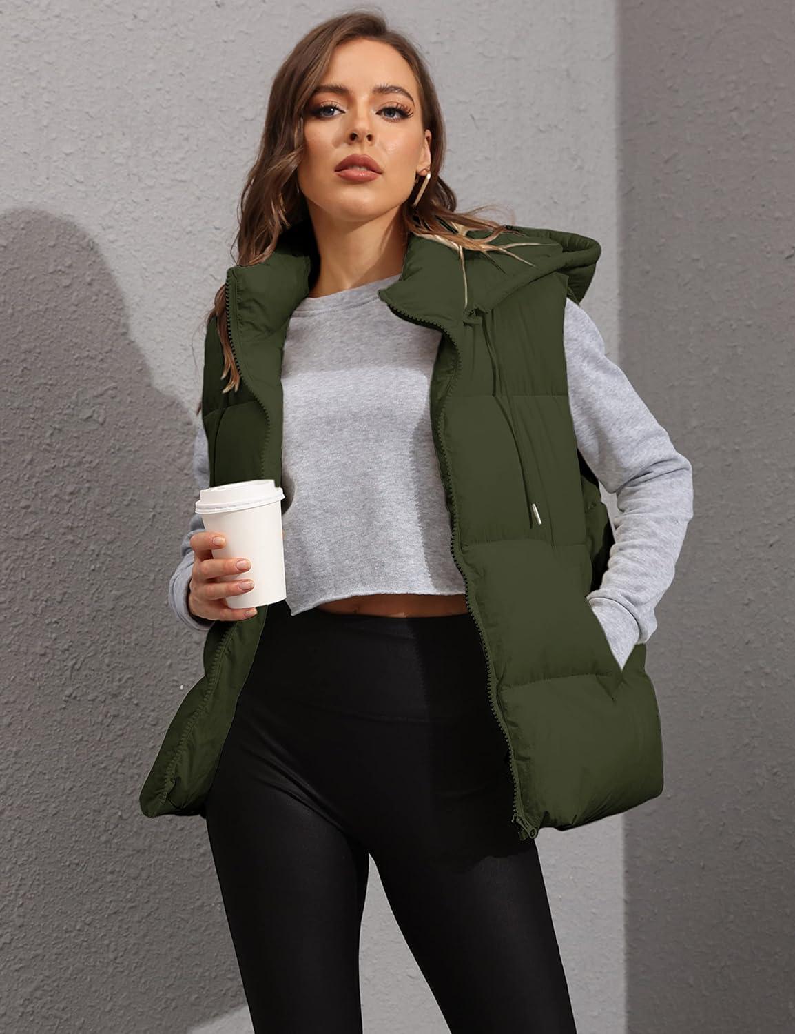 Tanming Black Puffer Vest Women Zip Up Lightweight Sleeveless Winter Outerwear Vests with Hood(Army Green)