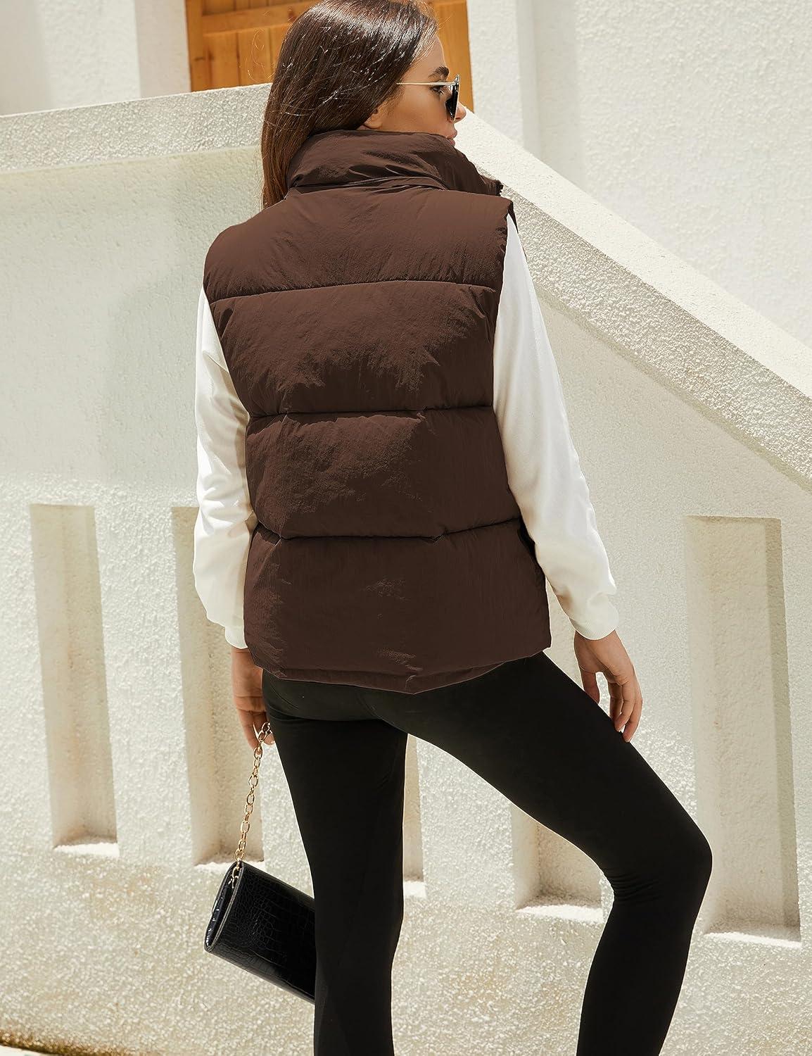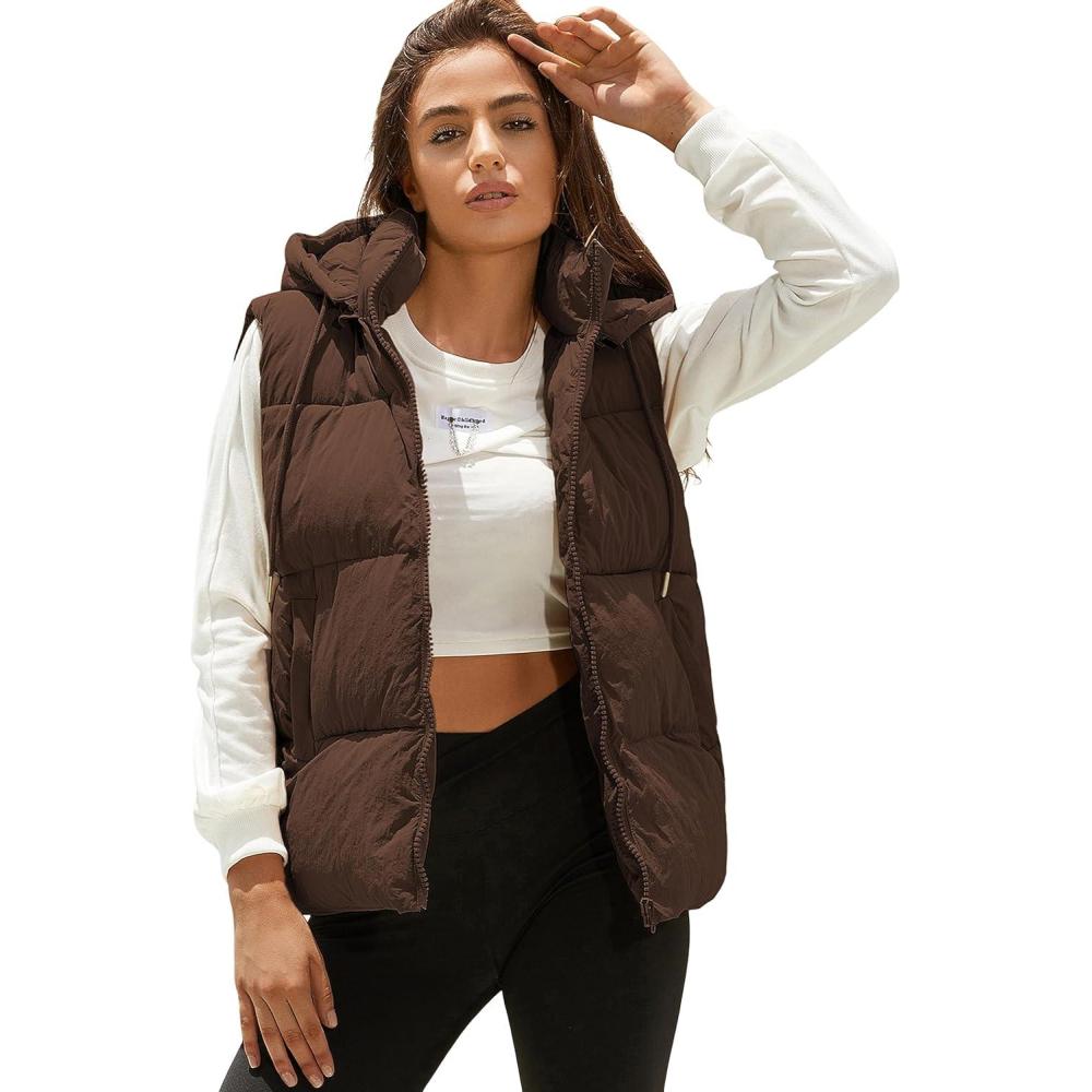 Tanming Black Puffer Vest Women Zip Up Lightweight Sleeveless Winter Outerwear Vests with Hood(Brown)