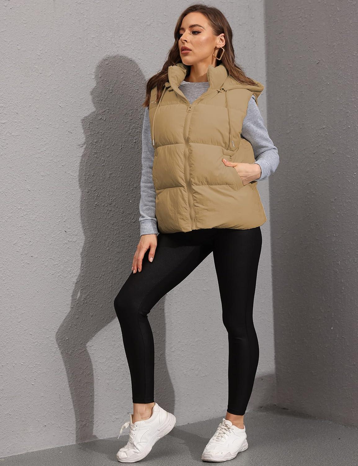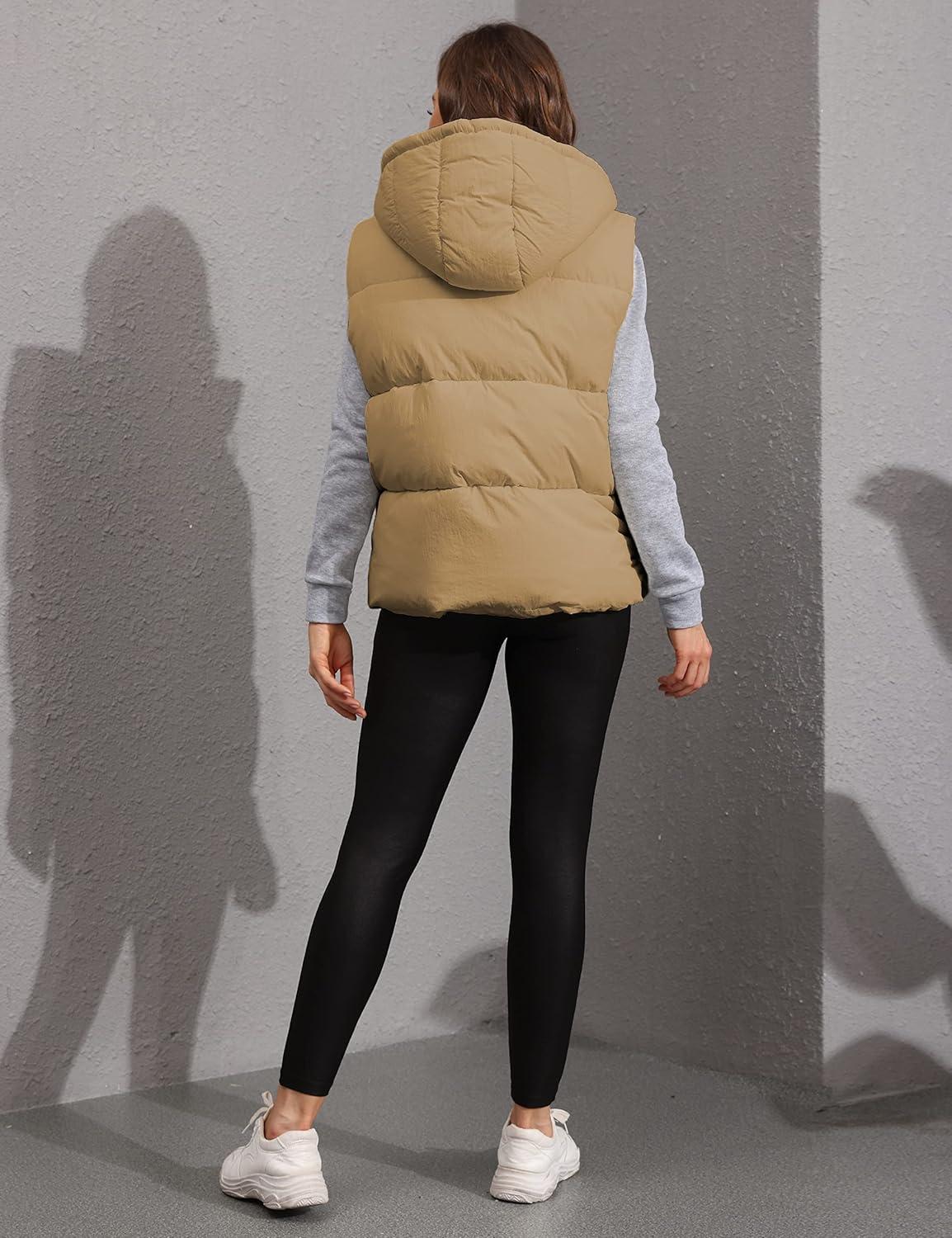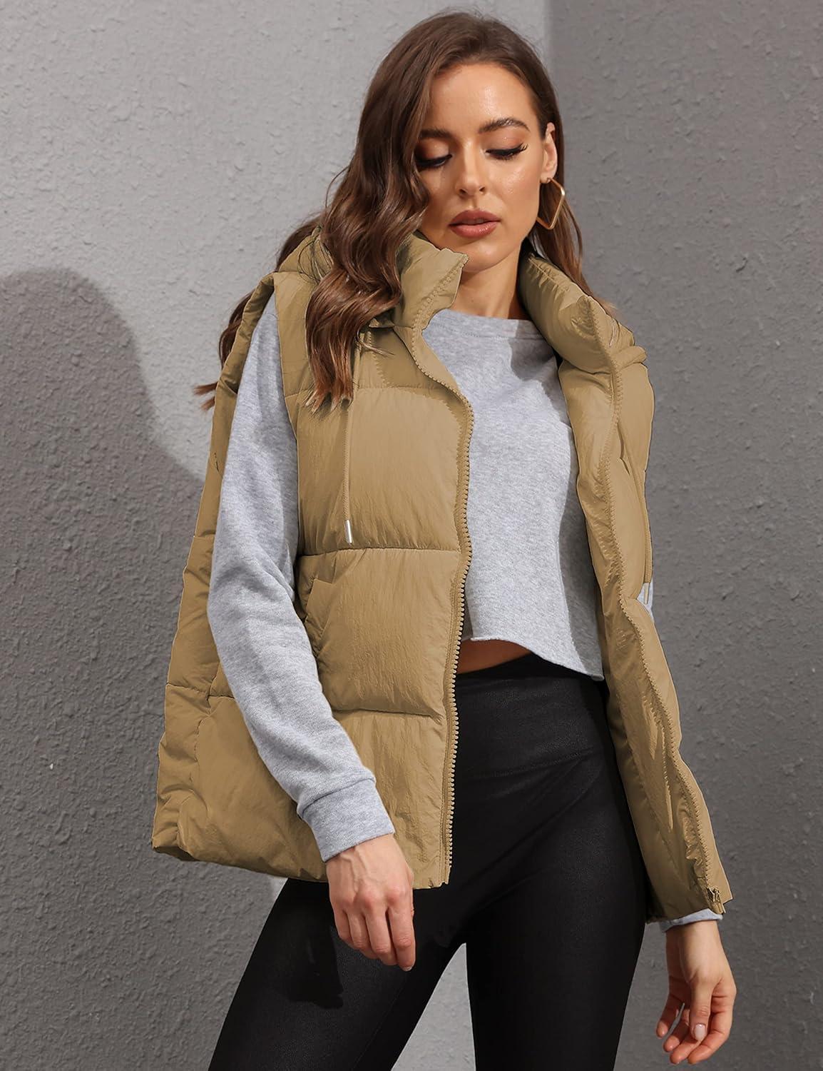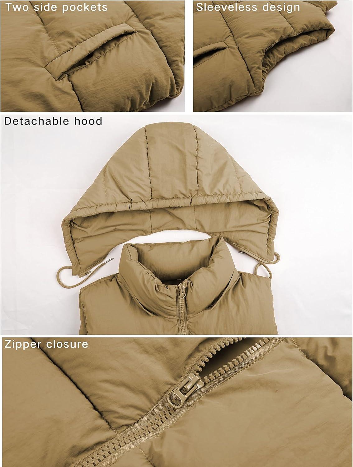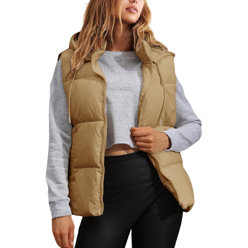 Tanming Black Puffer Vest Women Zip Up Lightweight Sleeveless Winter Outerwear Vests with Hood(Khaki)