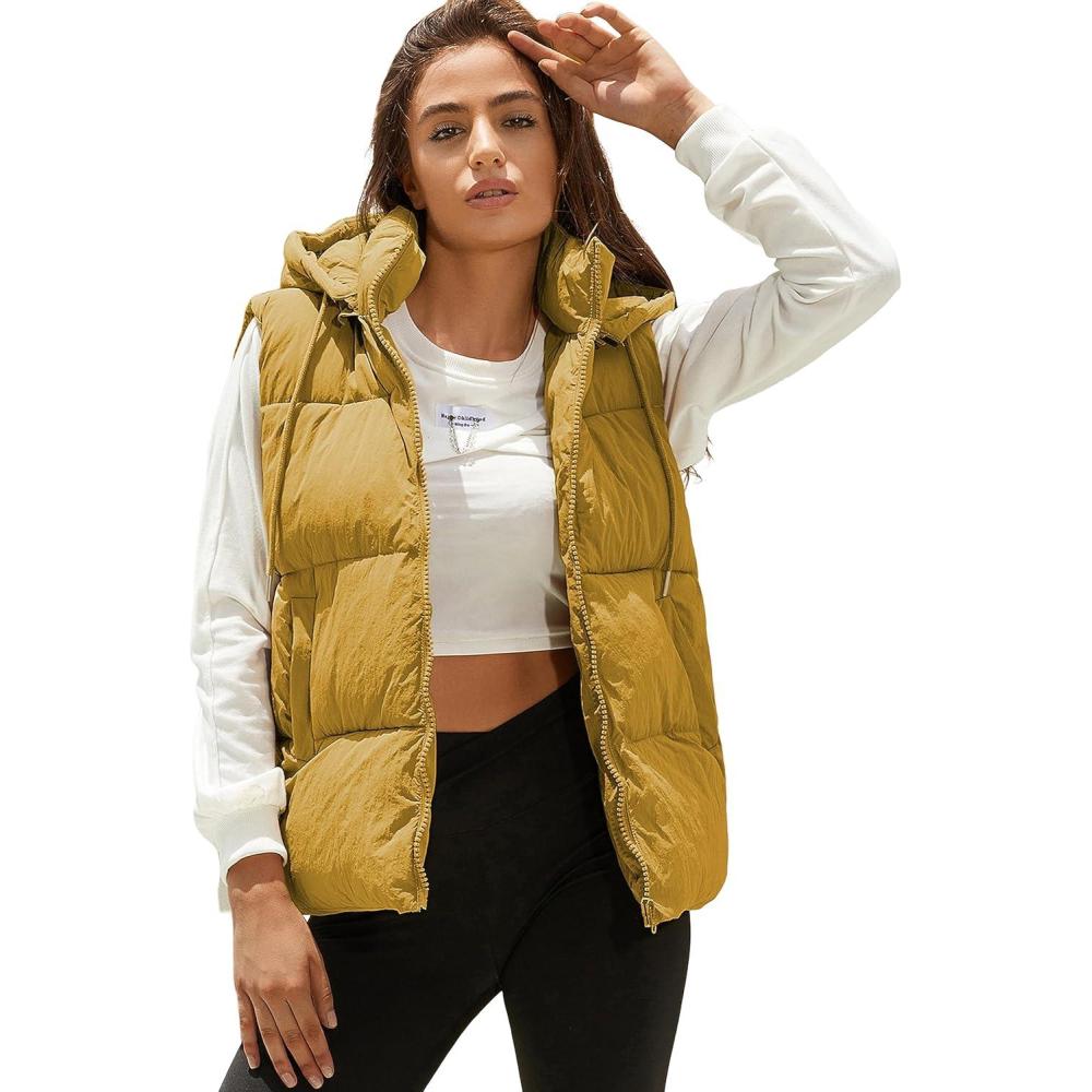 Tanming Black Puffer Vest Women Zip Up Lightweight Sleeveless Winter Outerwear Vests with Hood(Yellow)