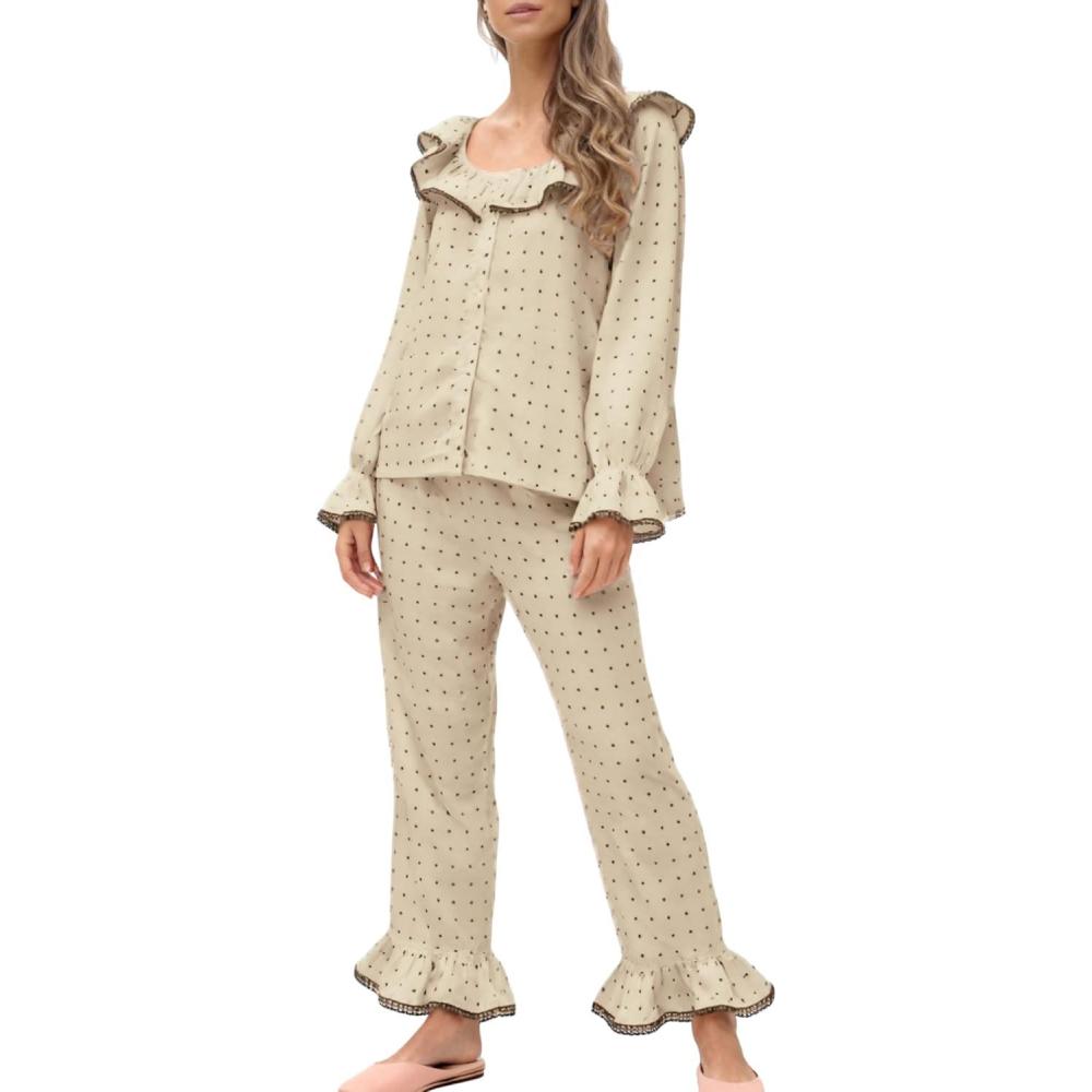 Be the first to review “Tanming Pajamas for Women Set Polka Dot Set Ruffled Collar Top Elastic Waist Pants Casual Pajama Set Two Piece Sleepwear(Apricot)” Cancel reply