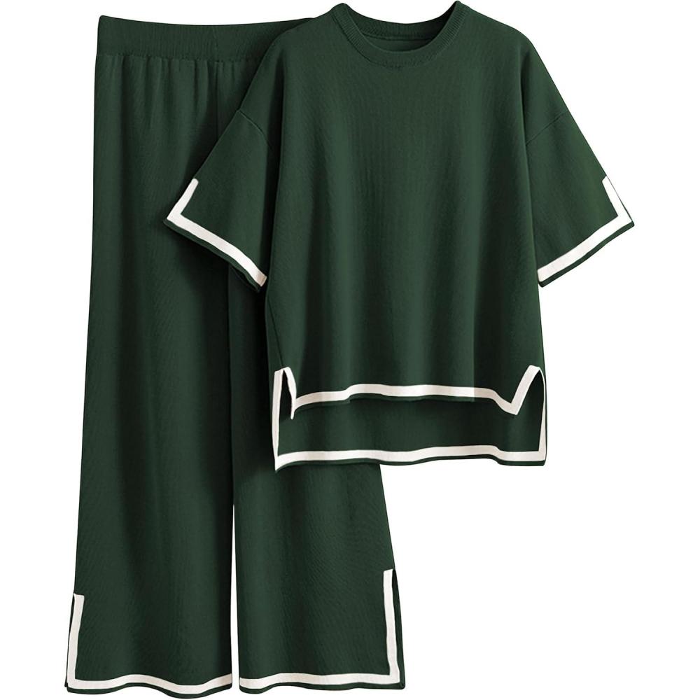 Tanming Sweater Sets Women 2 Piece Lounge Sets Short Sleeve Knit Pullover Tops Wide Leg Pants(Army Green)
