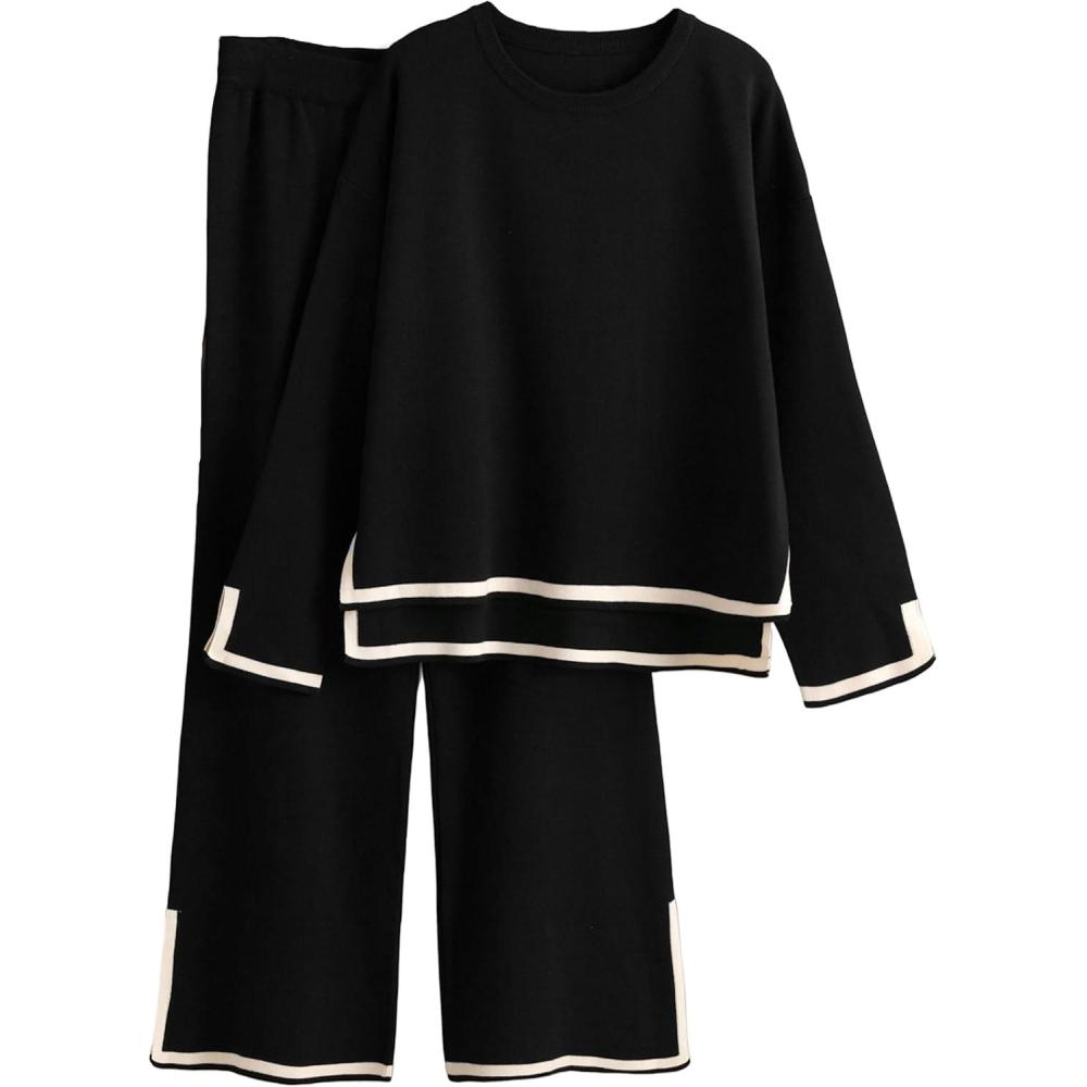 Tanming Women’s 2 Piece Outfits Long Sleeve Knit Sweater Top Wide Leg Pants Lounge Sets Tracksuits(Black)
