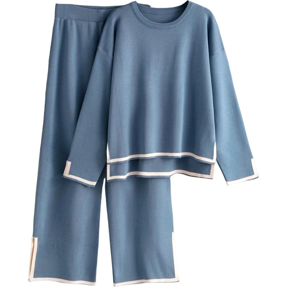 Tanming Women’s 2 Piece Outfits Long Sleeve Knit Sweater Top Wide Leg Pants Lounge Sets Tracksuits(Blue)