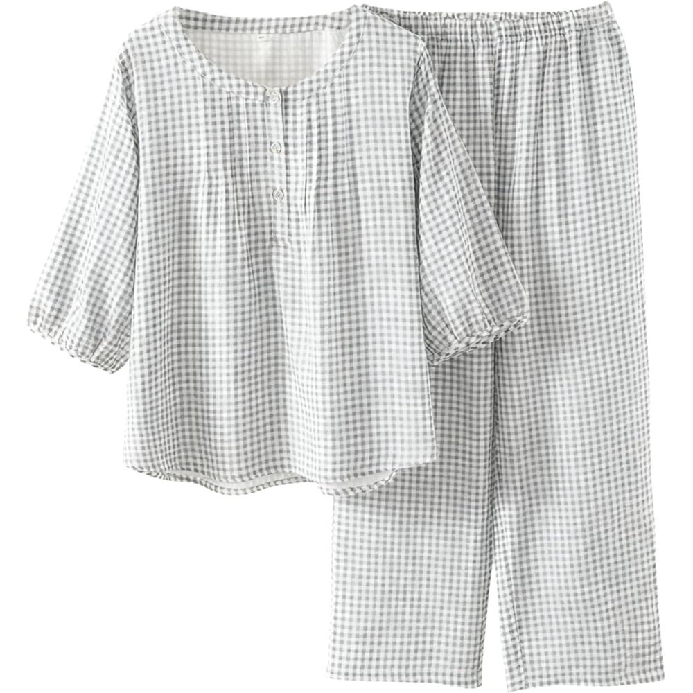 Tanming Womens 2 Set Gingham Pajama Set Half Sleeve Shirt Wide Leg Pants Y2K Cotton Matching Lounge Set Beach Outfits(Light Grey)