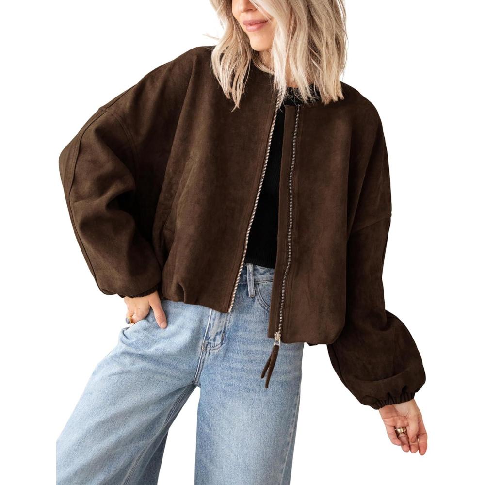 Tanming Womens Faux Suede Leather Jacket Casual Oversized Long Sleeve Zip Up Bomber Jackets Coats Outerwear(Coffee)