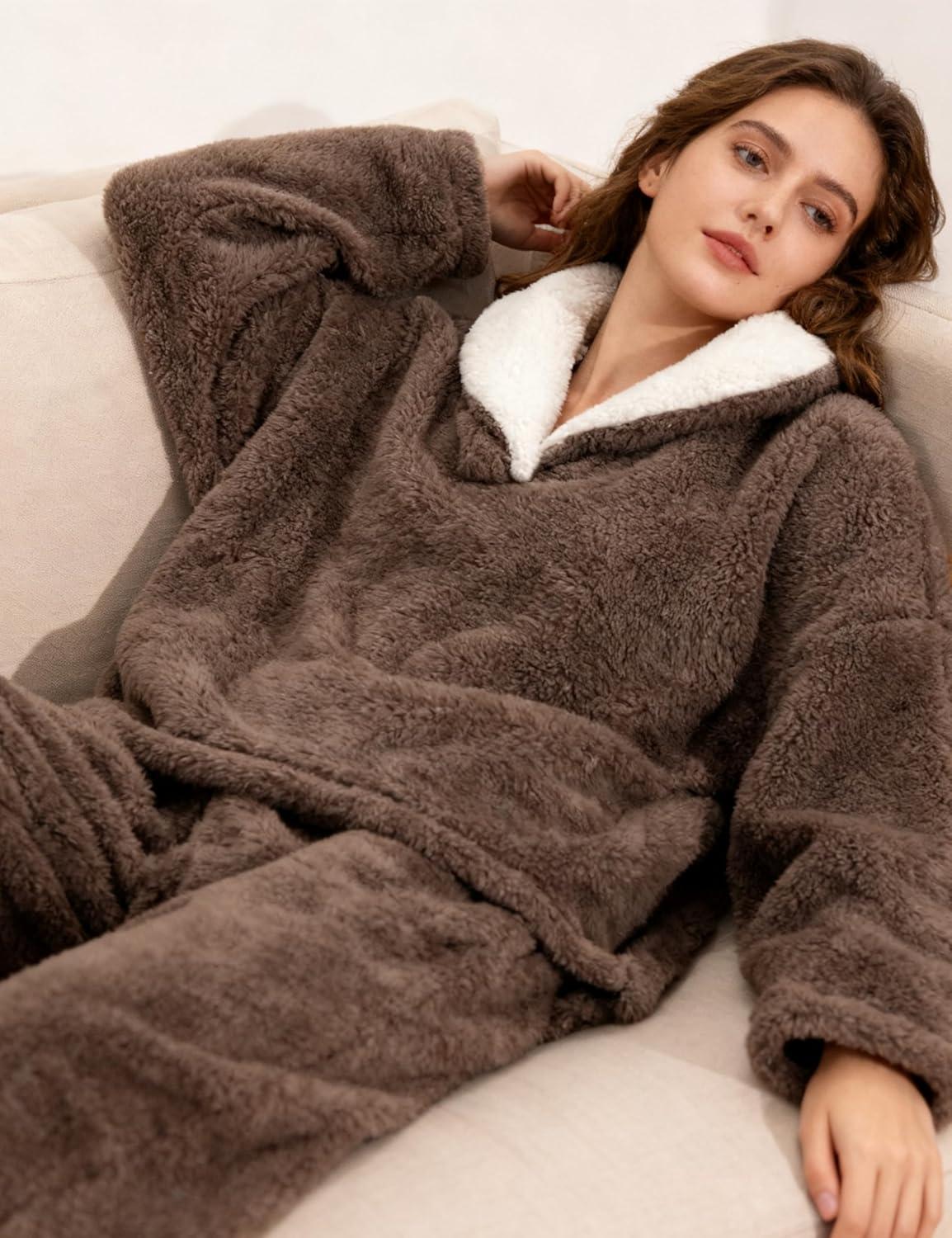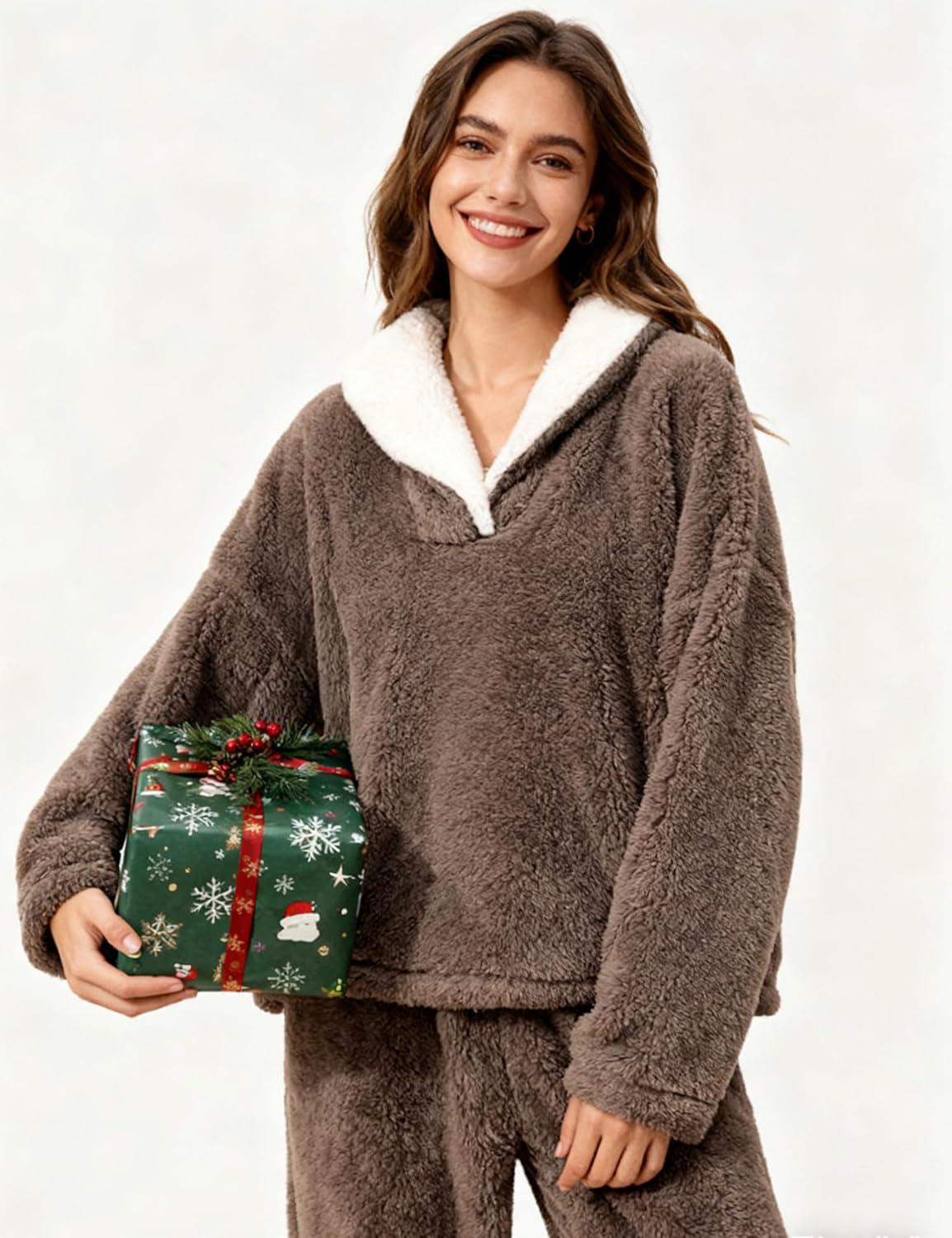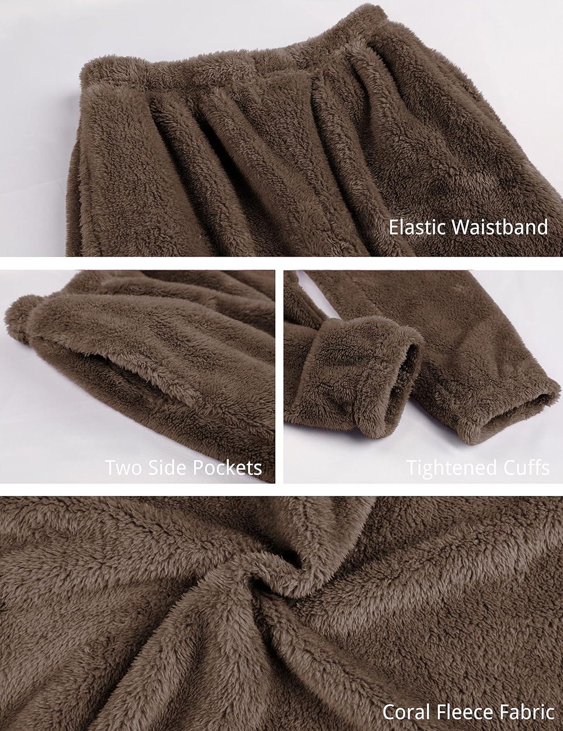 Tanming Womens Fluffy Pajamas Set Fleece Pullover Pants Plush Loungewear Sleepwear(Brown)