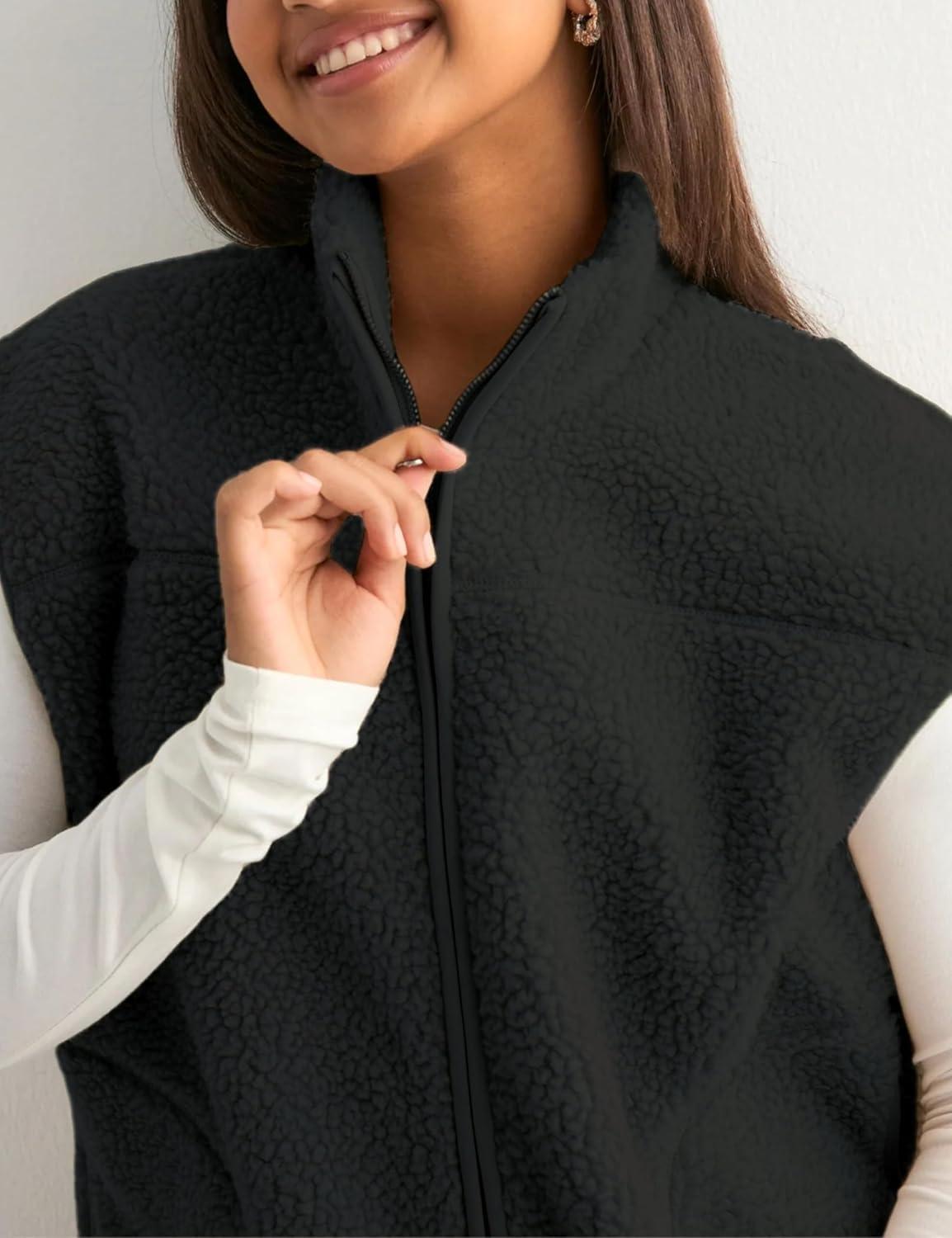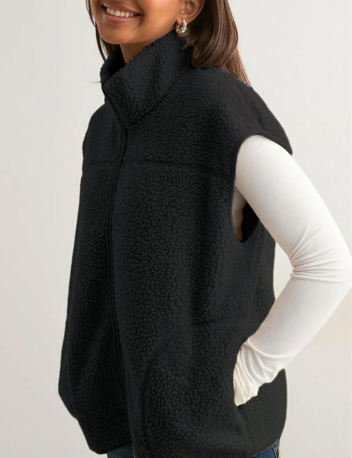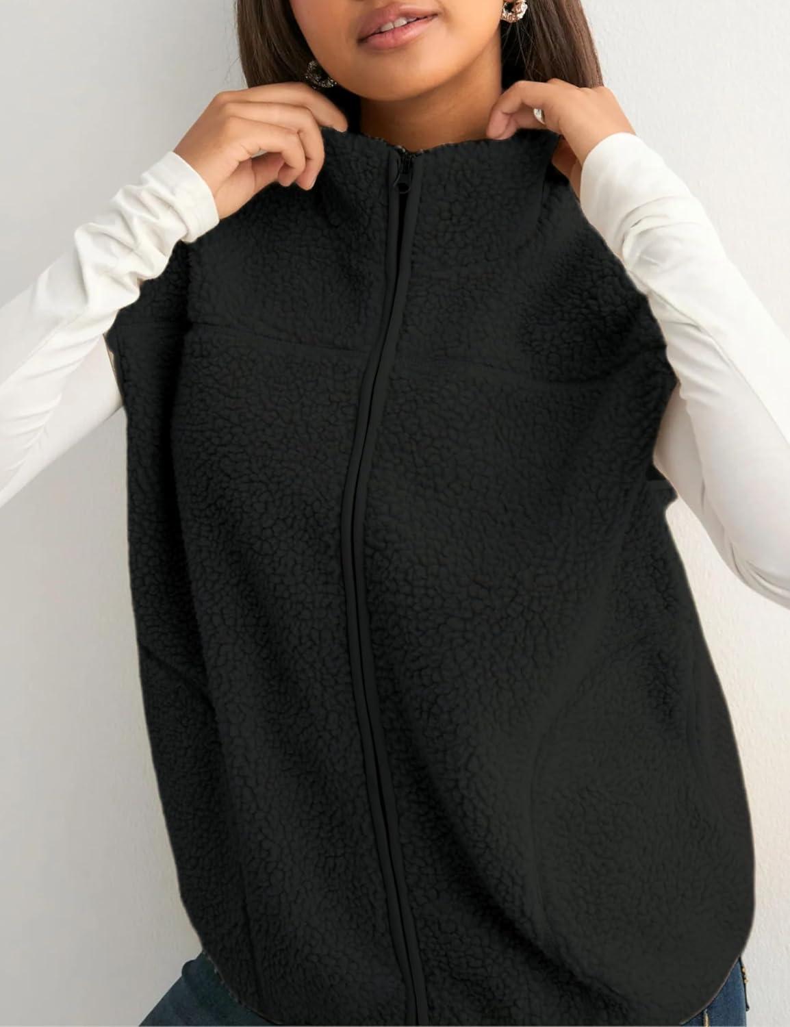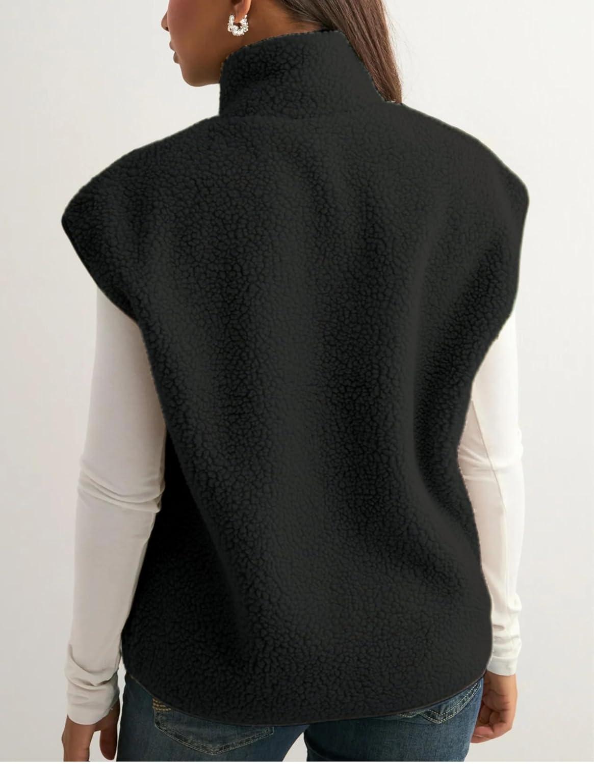 Tanming Womens Fuzzy Sherpa Fleece Vest Lightweight Cozy Sleeveless Gilet Zip Up Jacket with Pockets(Black)