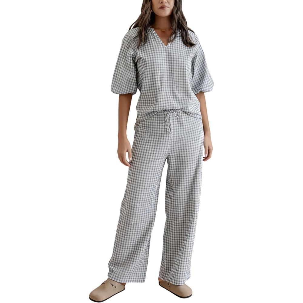 Tanming Womens Gingham Pajama Sets Plaid 2 Piece Lounge Outfits Sleepwear Half Sleeve Long Pant Nightwear Soft Y2K Pjs(Grey)