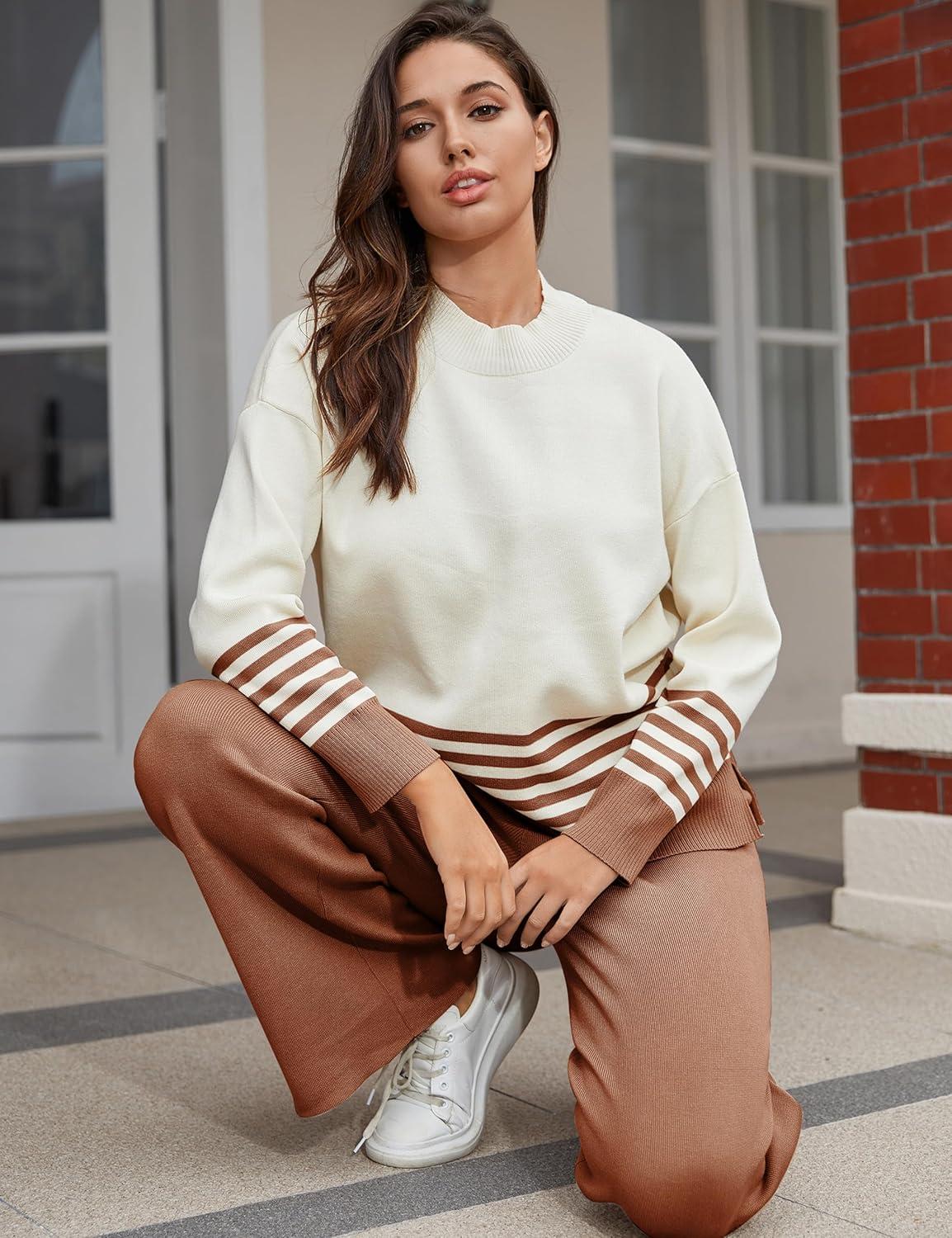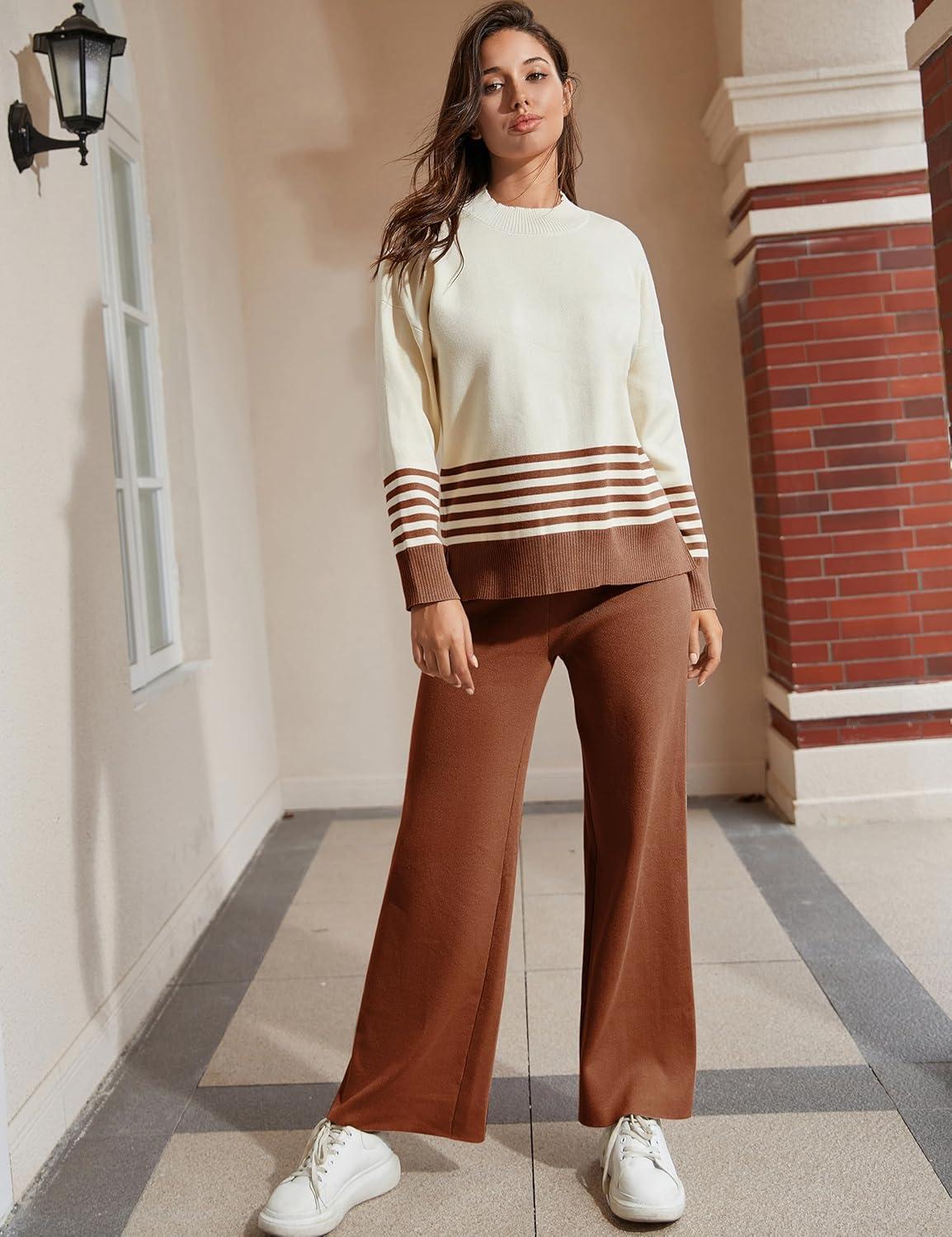 Tanming Women’s Lounge Sets 2 Piece Outfits Knitted Pullover Sweater Tops Wide Leg Pants Tracksuit(Rust)
