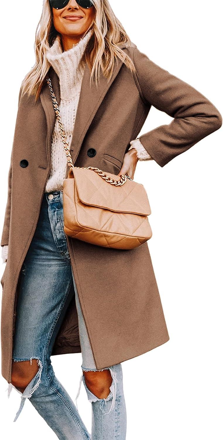 Tanming Women’s Notch Lapel Double Breasted Wool Blend Mid Long Pea Trench Coat(Camel)