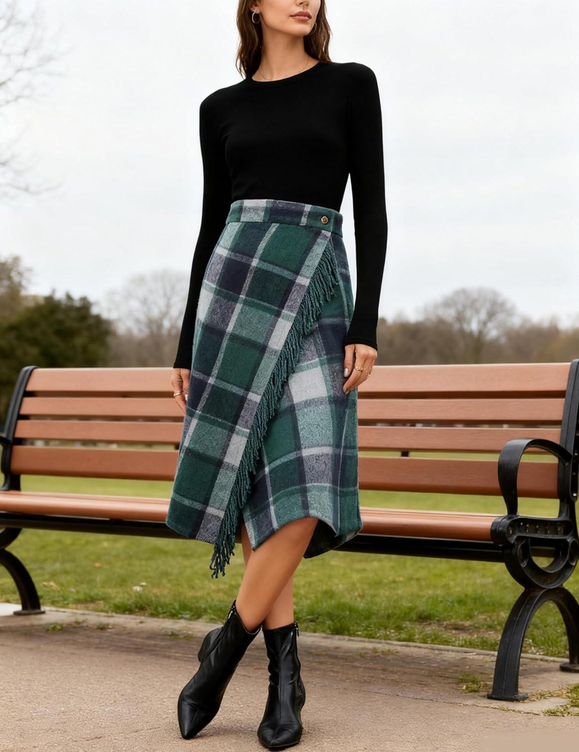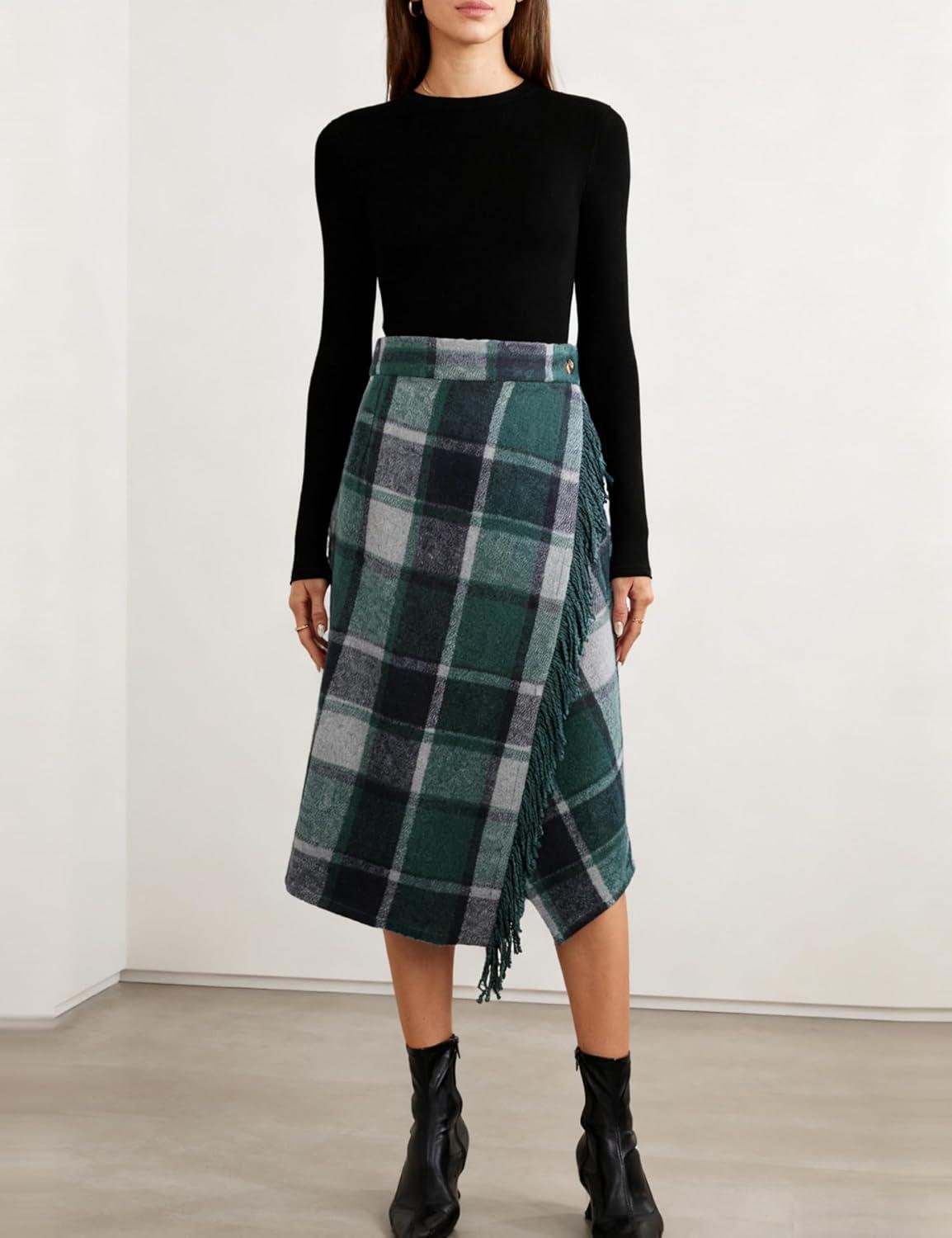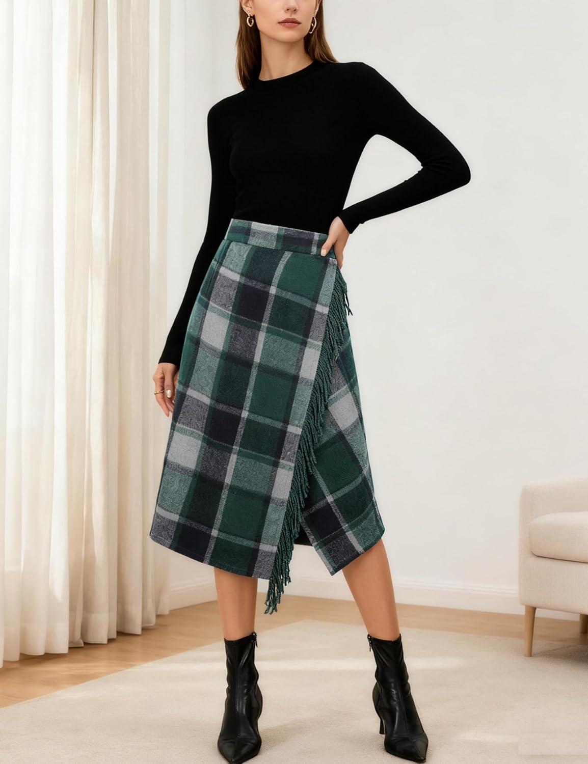Get up to 60% off on Tanming Womens Plaid Fringed Midi Skirt A Line Warm Wool Wrap Skirt Fall Winter Tartan Dress(Green) styles during our winter sale event.