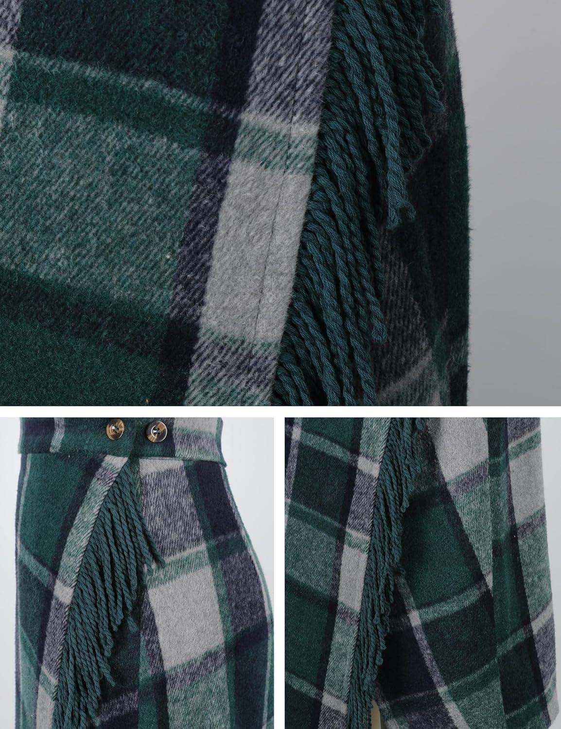 Tanming Womens Plaid Fringed Midi Skirt A Line Warm Wool Wrap Skirt Fall Winter Tartan Dress(Green)