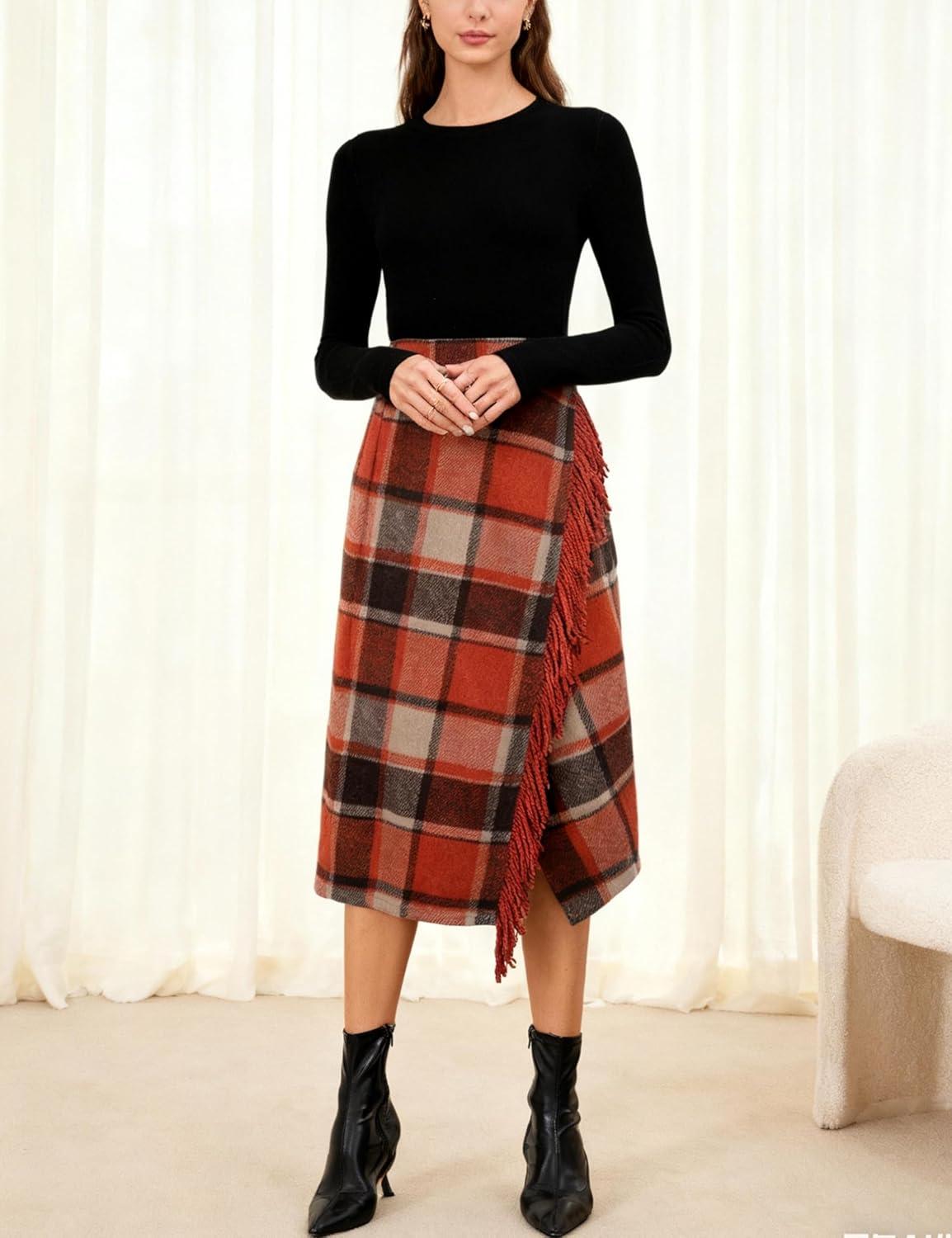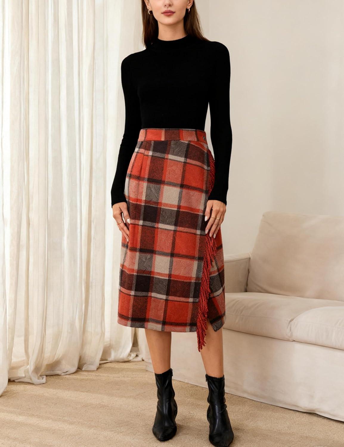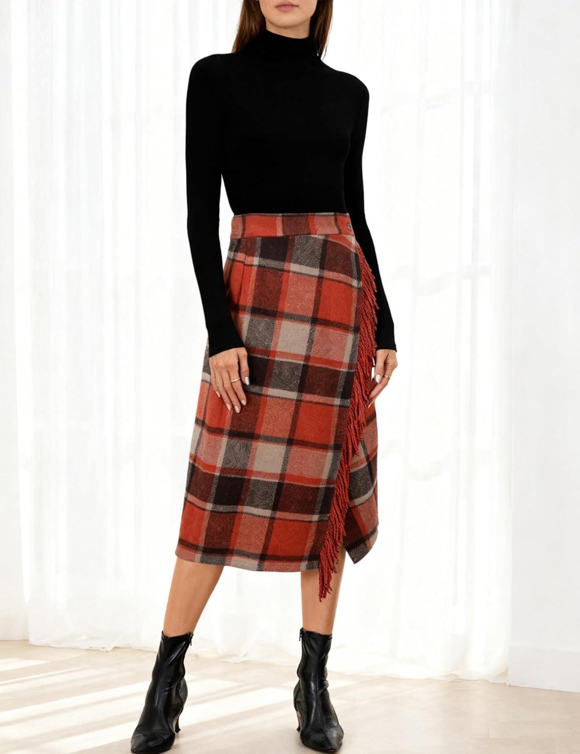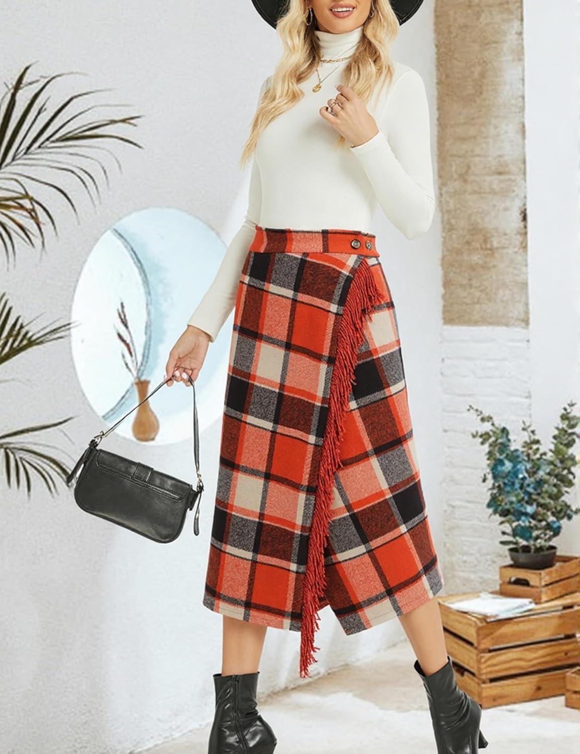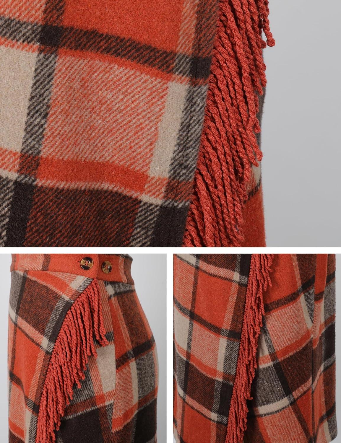 Tanming Womens Plaid Fringed Midi Skirt A Line Warm Wool Wrap Skirt Fall Winter Tartan Dress(Orange)