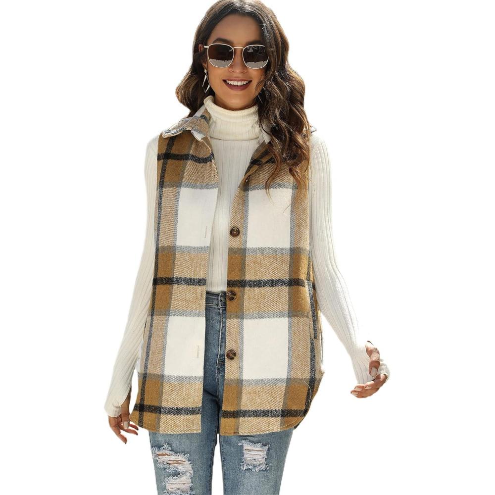 Tanming Women’s Plaid Vest Brushed Flannel Sleeveless Shacket Shirt Jacket with Pockets(Khaki)