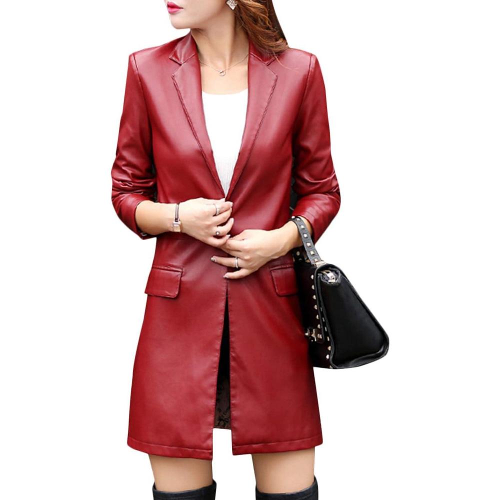 Tanming Womens PU Faux Leather Jacket Casual Lapel Long Suit Trench Coat Outerwear(Wine Red)