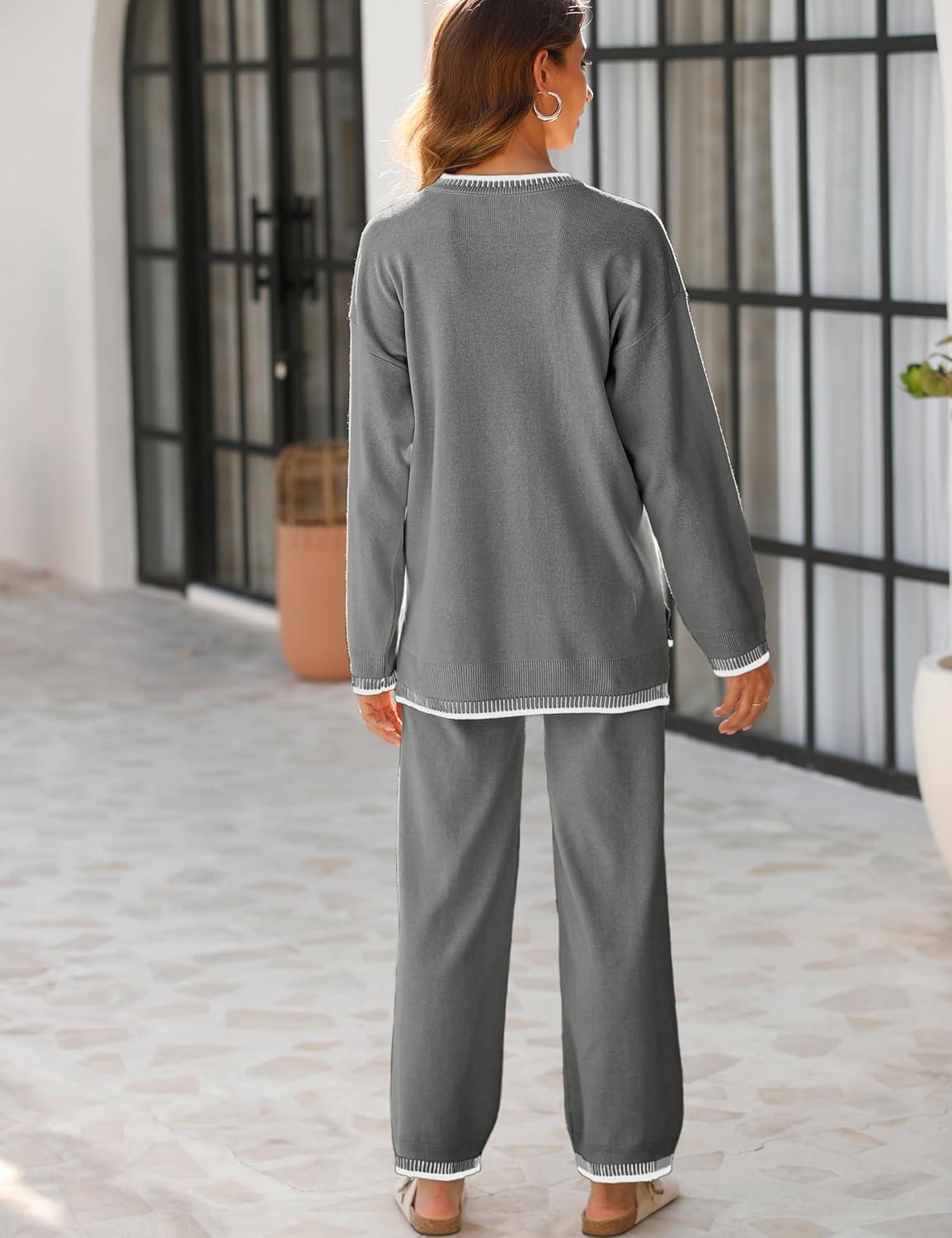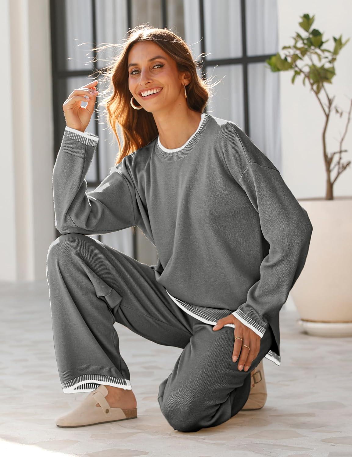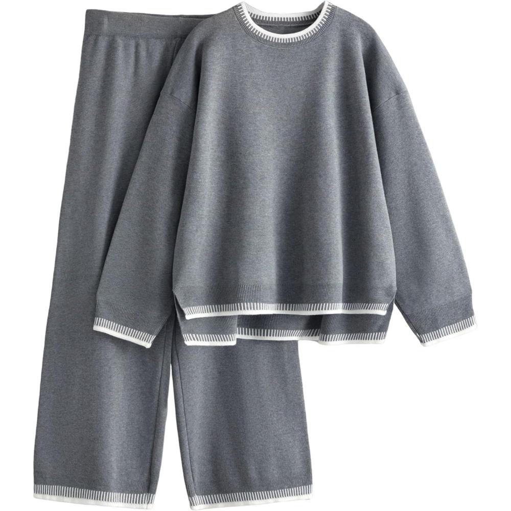 Tanming Women’s Sweater Sets 2 Piece Outfits Knitted Pullover Jumper and Wide Leg Pants Tracksuit(Grey)