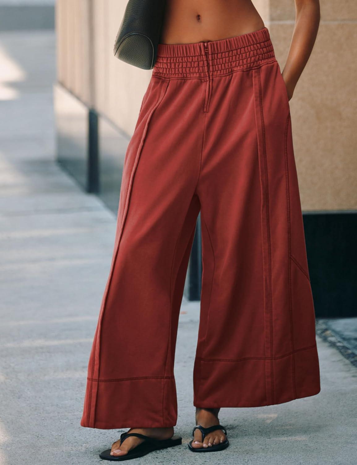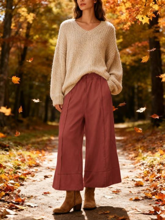 Tanming Womens Wide Leg Pants Casual Elastic High Waisted Palazzo Pant Loose Cotton Sweatpants with Pockets(Rust)