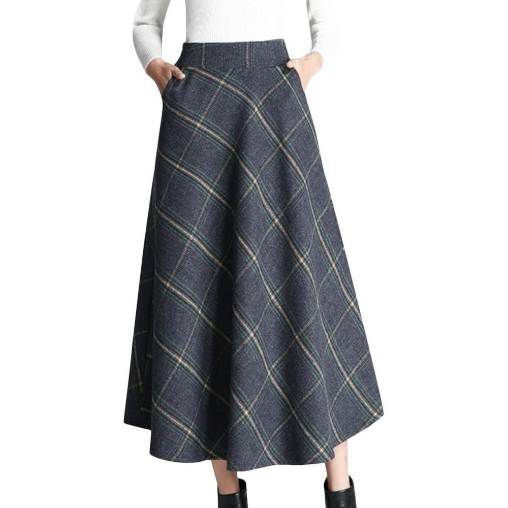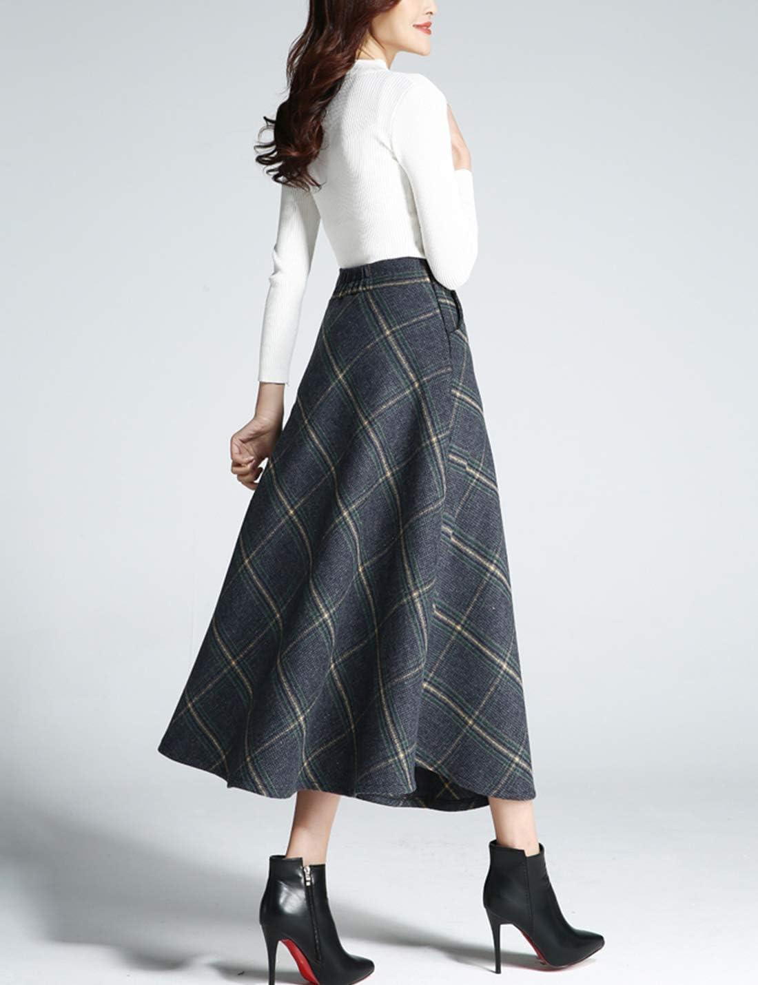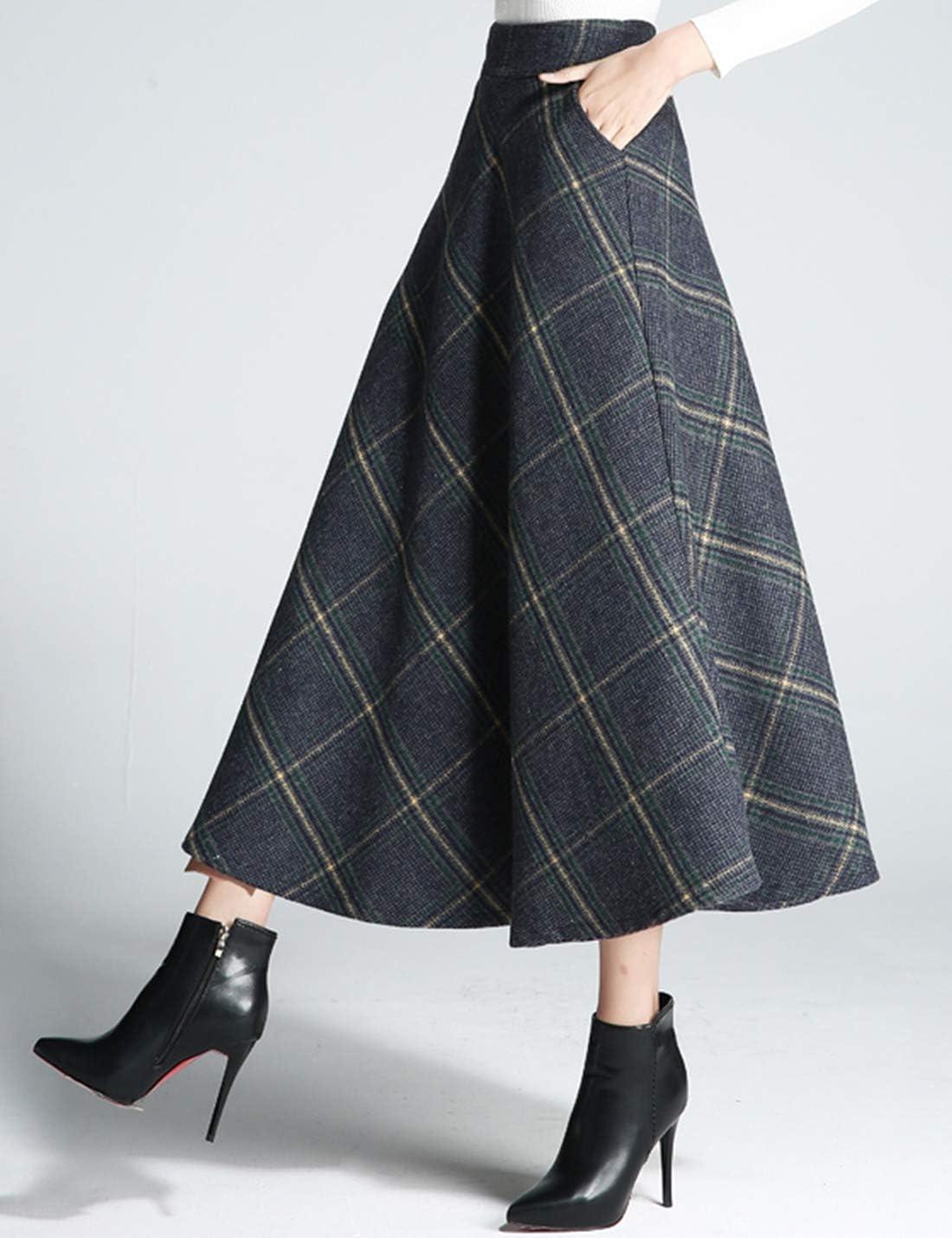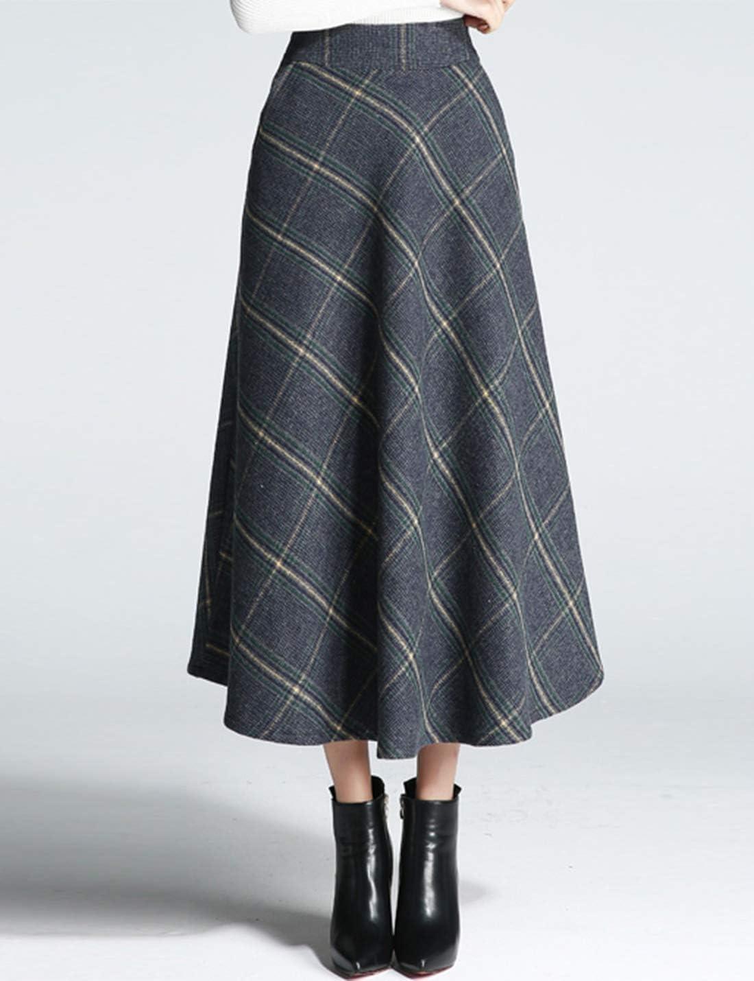 Tanming Women’s Winter Warm Elastic Waist Wool Plaid A-Line Pleated Long Skirt(Blue Grey)
