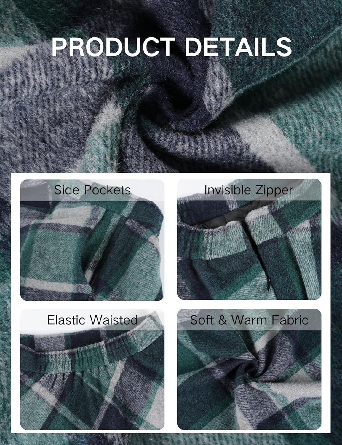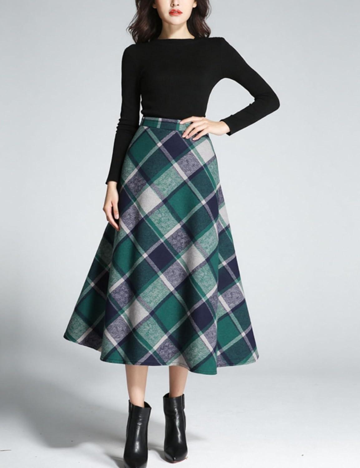 Tanming Women’s Winter Warm Elastic Waist Wool Plaid A-Line Pleated Long Skirt(Plaid Green)