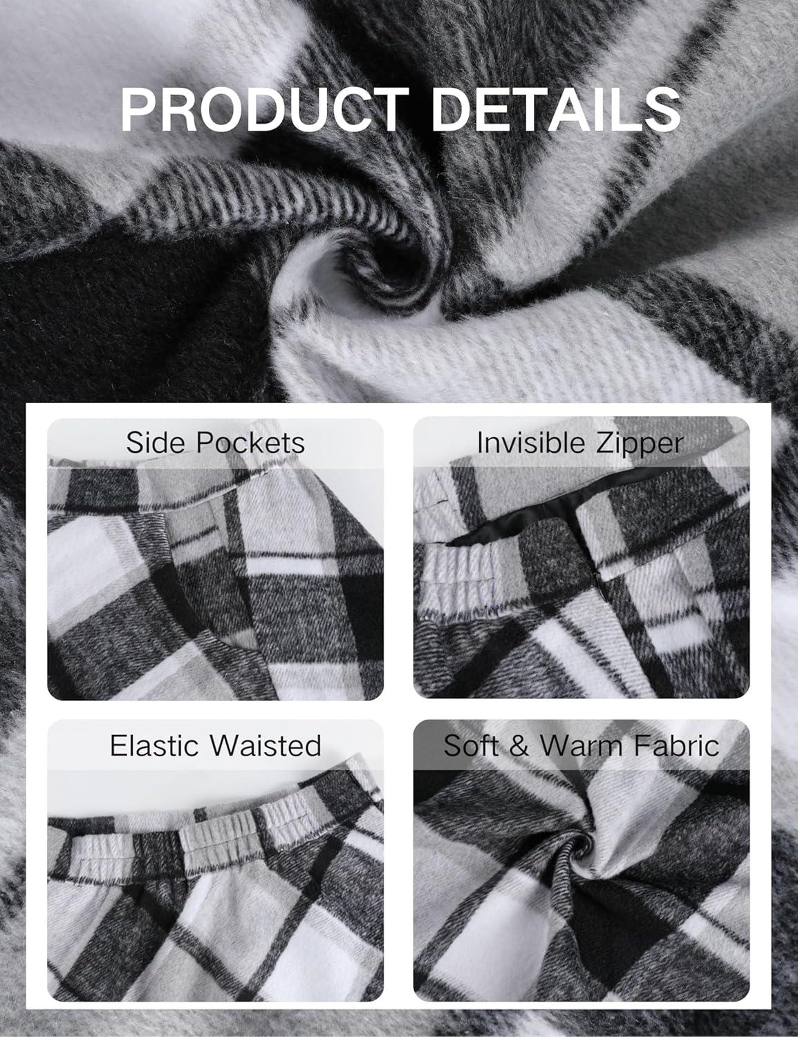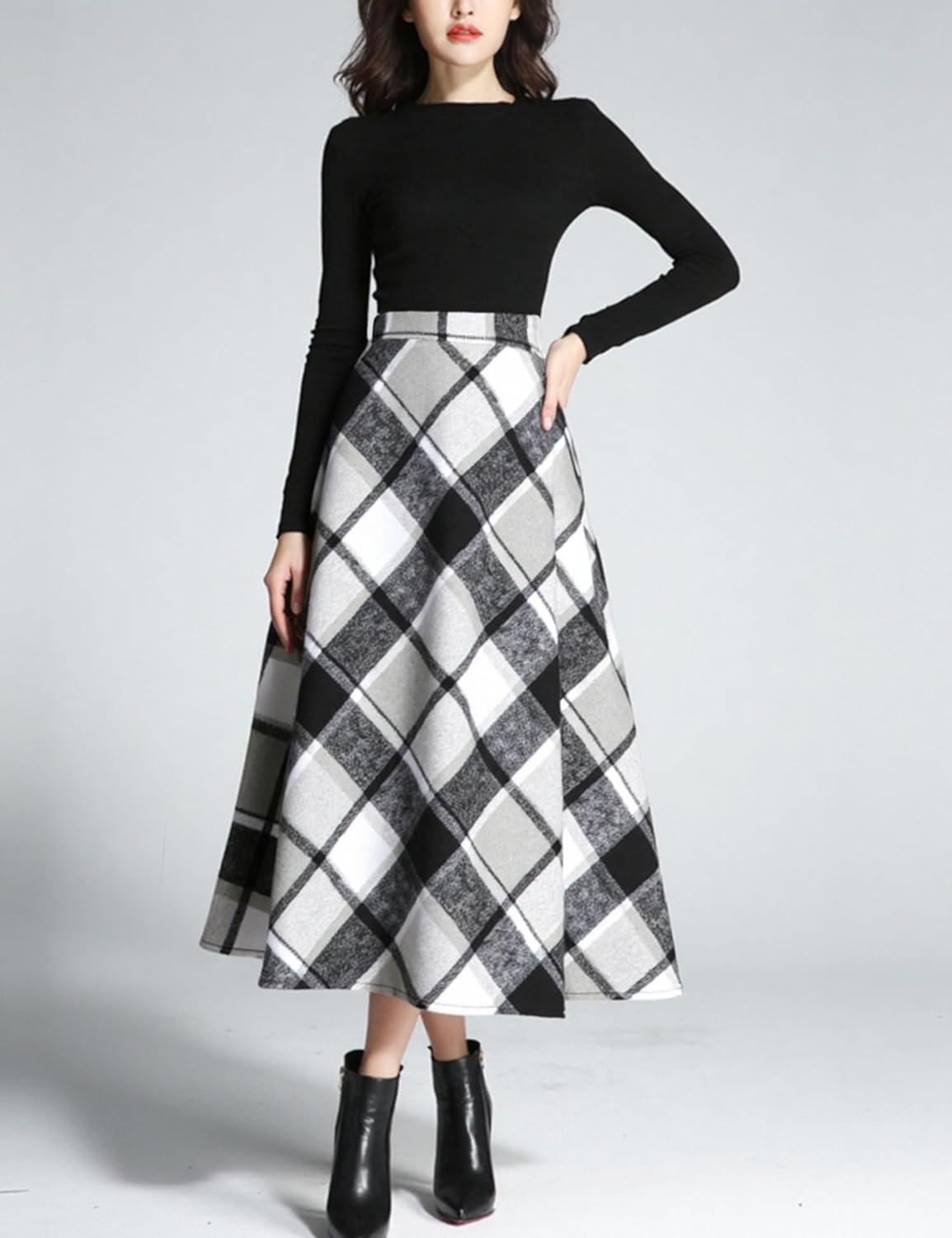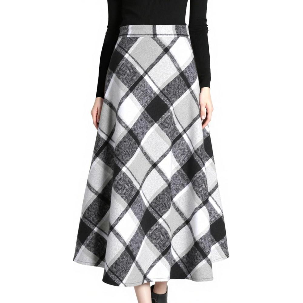 Tanming Women’s Winter Warm Elastic Waist Wool Plaid A-Line Pleated Long Skirt(Plaid Grey)